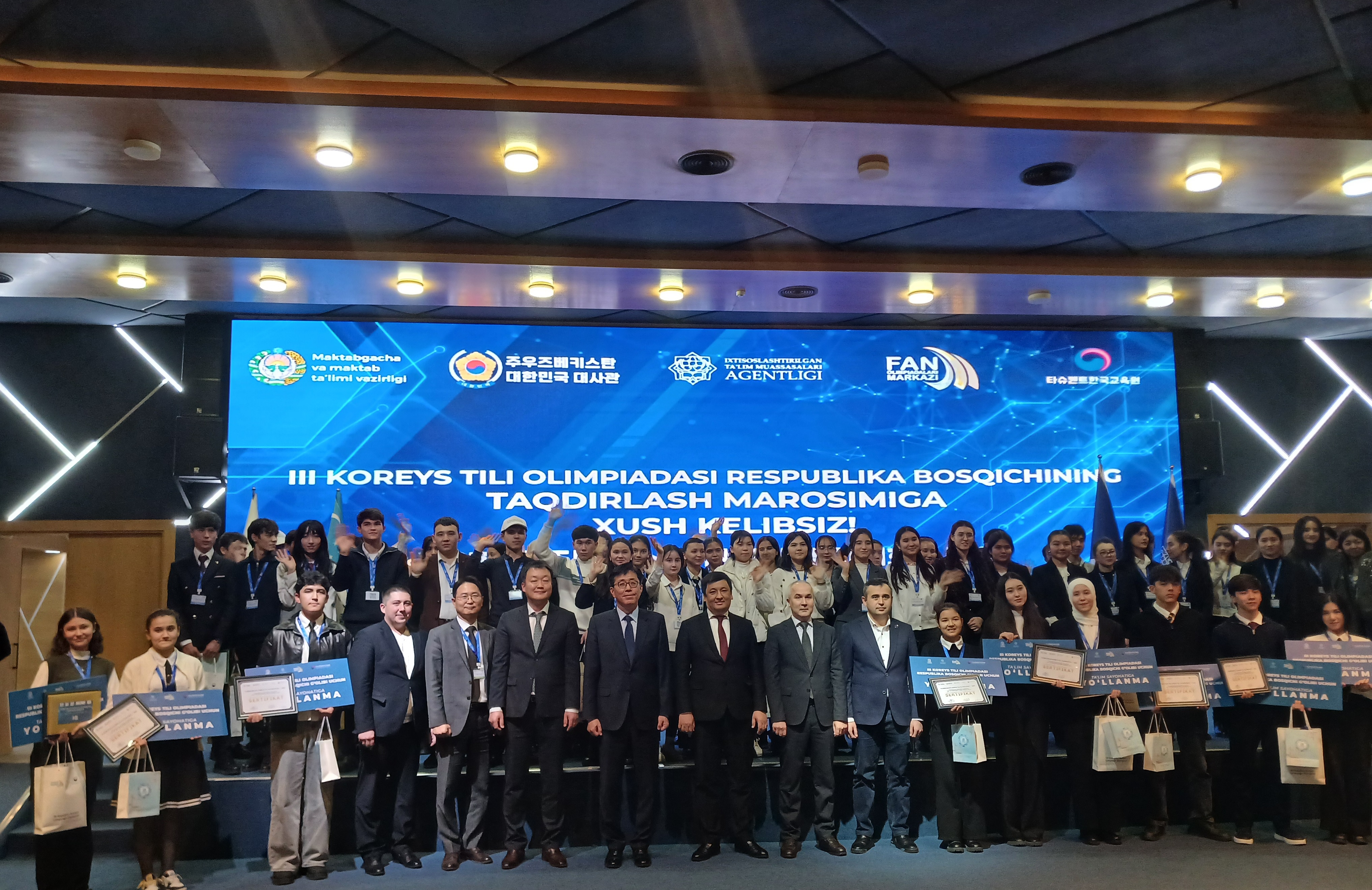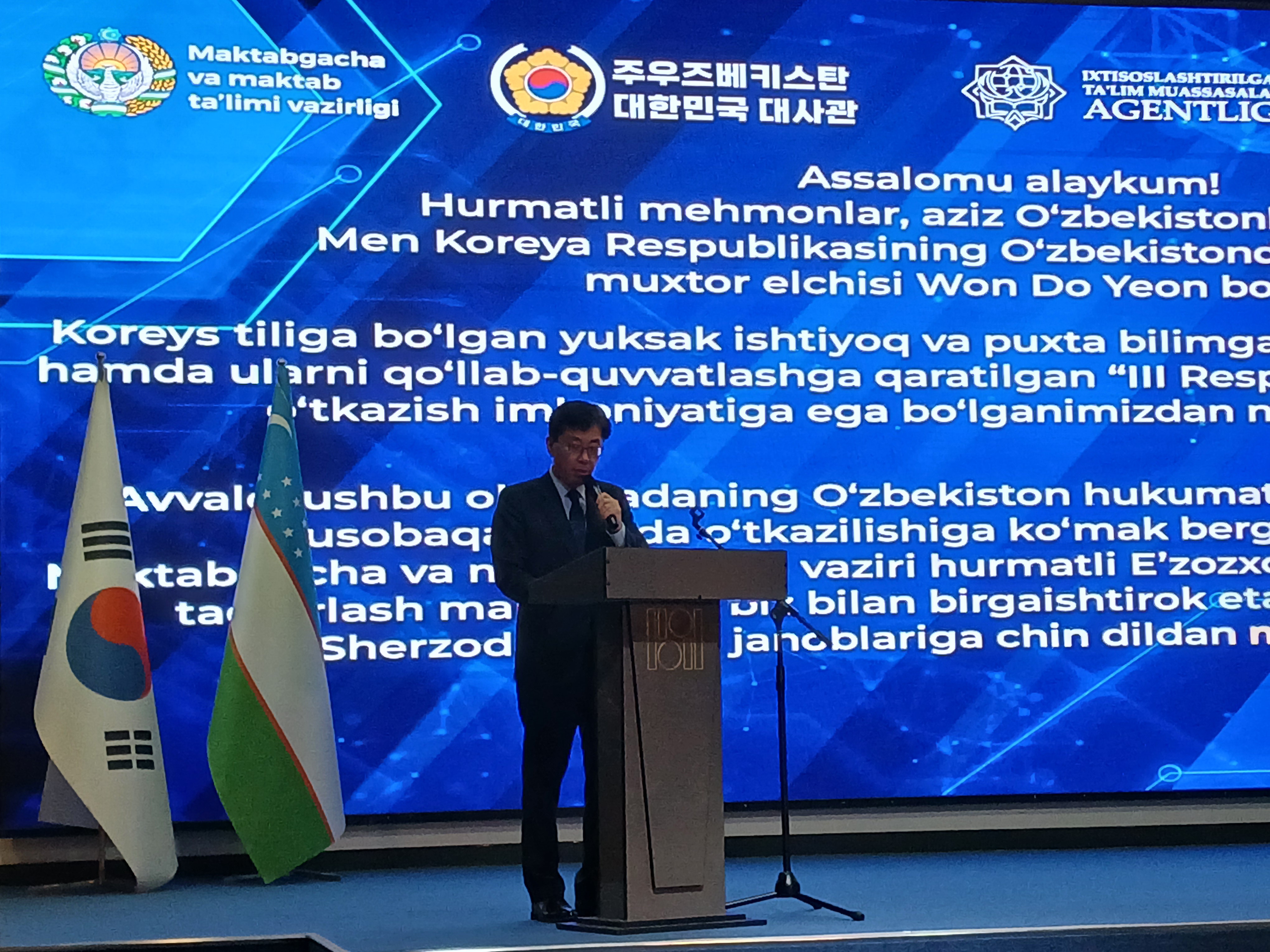 우리 대사관 원도연 대사는 12.21.(일) 개최된 '제3회 우즈베키스탄 한국어 경시대회' 시상식에 참석하였습니다. 원 대사는 시상식에 앞서 카리모브 셰르조드 유아일반교육부 수석차관과 한국어 교육 발전 방안에 대해 의견을 교환하였으며, 이어 시상식 축사를 통해 한국어 교육이 한-우즈벡 교류 확대의 가교 역할을 하고 있음을 평가하고 학생들의 한국어에 대한 열정과 노력을 격려하였습니다.